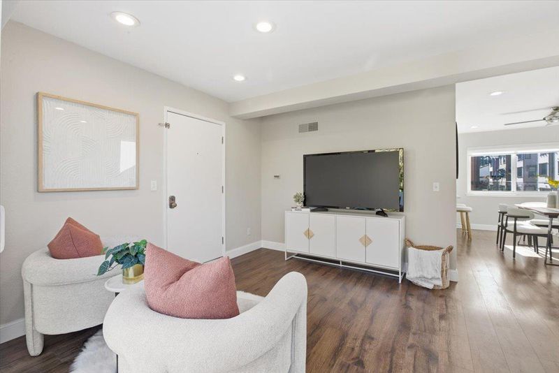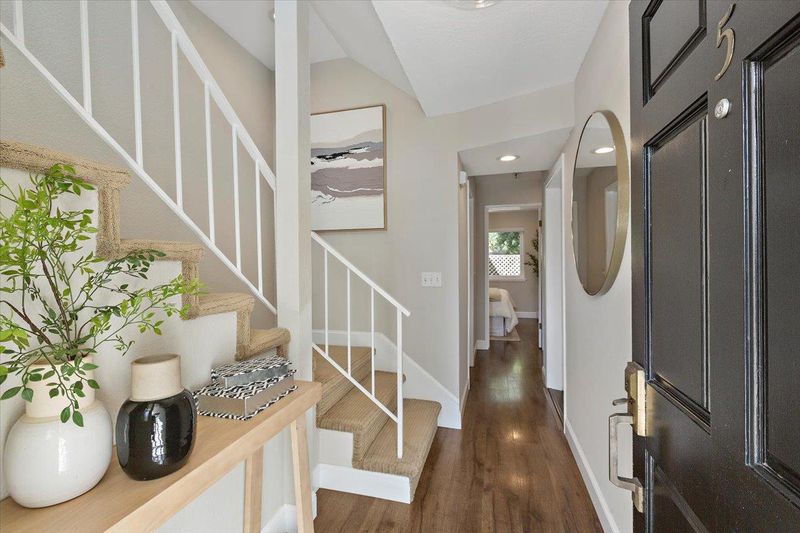 Welcome to this beautifully updated, light-filled 3 bedroom, 2 bath townhome in a well maintained community that combines comfort, convenience, & style. The flexible floorplan offers 2 bedrooms & a full bath on the first floor, 1 with sliding glass doors that open to a large private patio with direct access to the communitys greenbelt, perfect for indoor & outdoor living. Upstairs, the oversized primary suite is a true retreat, featuring laminate wood floors, a walk-in closet, & sliding doors to a sunny private balcony with treetop views. The main living area boasts a bright & open great room layout with a welcoming living room, fireplace, & sitting area. A separate dining space & another private balcony with lush garden views make entertaining a delight. The updated kitchen is designed for both style and function, complete with shaker style cabinets, a breakfast bar, stainless appliances, & a charming garden window. Additional highlights include a formal entry with wood laminate floors, abundant natural light throughout, & a huge attached two-car garage with custom storage cabinets. Located in a small, well-cared-for community close to shopping, parks, schools, & freeway access, this home truly shows pride of ownership and offers the perfect blend of relaxation and convenience.