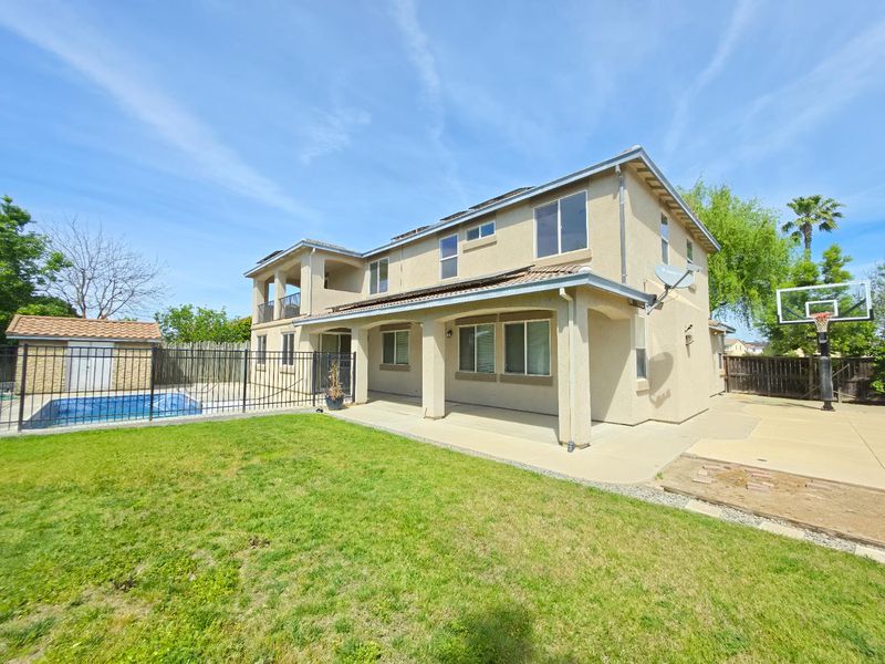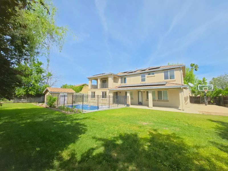 Located in the gated Greenhills community, this stunning home showcases a bright, open-concept layout anchored by a modern kitchen. Highlights include distinctive natural-edge granite countertops, a stylish tile backsplash, a large island with sink, stainless steel appliances, and a walk-in pantry. The backyard is a true entertainer's retreat, featuring a saltwater pool, basketball court, sandbox, and a dedicated lounge area complete with an outdoor TV. Backing directly onto the 18th hole of the golf course, the property offers sweeping, unobstructed views of lush green fairways. Just off the backyard, a separate guest house room with a full bathroom. Upstairs, the expansive primary suite offers a private balcony, a generously sized bathroom with dual sinks, and two walk-in closets. Additional features include solar panels for enhanced energy efficiency and reduced utility costs.