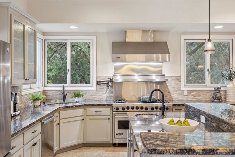 Nestled on a quiet street in Alamo’s desirable Westside, this remodeled custom home blends luxury and comfort. The stainless and granite chef’s kitchen shines with a Viking range, pantry and wine refrigerator—perfect for everyday living or entertaining. Hardwood floors, cathedral ceilings, skylights and Anderson windows add warmth and sophistication throughout 3,100+ square feet of open architecture. The main level offers effortless living with 2 bedrooms and 2 baths, including a level-in entry and a private, spacious patio. The tranquil primary retreat features a glass shower and jetted tub; a separate wing provides 2 additional bedrooms with a Jack and Jill bath. Outdoors, enjoy a serene oasis with a refinished pool, newer pavers and a lush green landscape, perfect for entertaining or relaxation. A spacious dog run with low-maintenance turf enhances functionality. Peaceful and private, this home is tucked back on a private lane backing to the Iron Horse Trail—just 0.9 miles from Murwood Elementary and near WCI and Las Lomas High, (test scores 9&10). Owned solar completes this exceptional offering at an equally exceptional value. Lowest $/F SF home.
