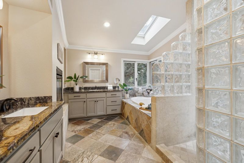 - Shower Over Tub, Skylight(s), Solid Surface, Split Bath, Tile, Updated Baths