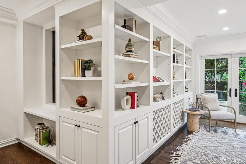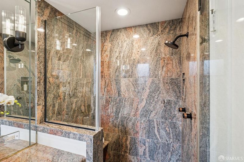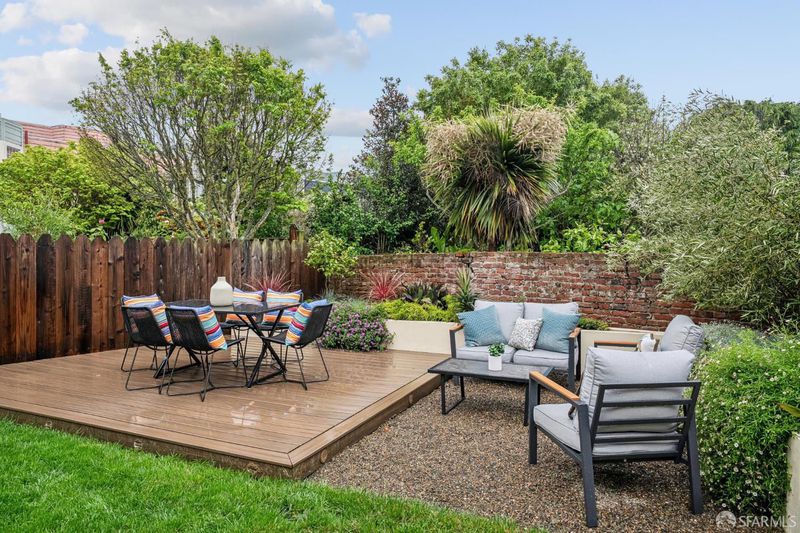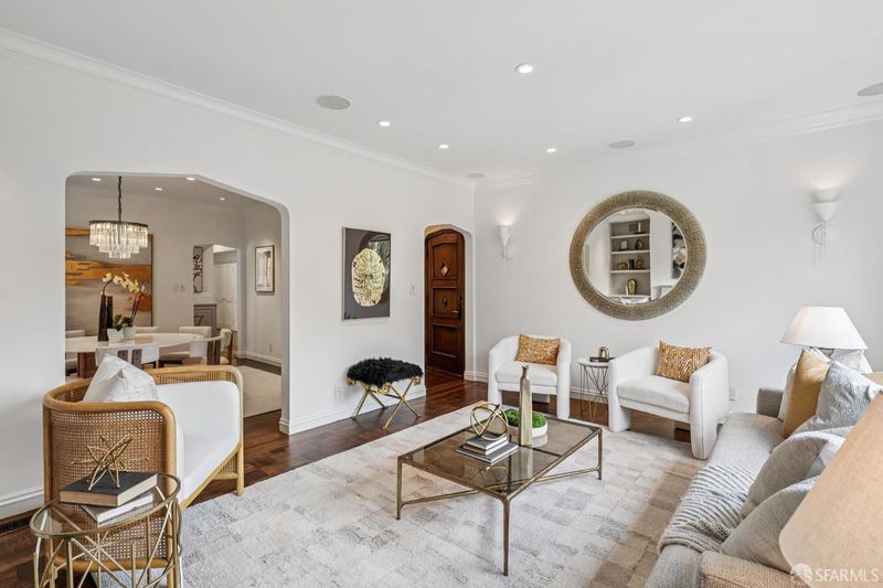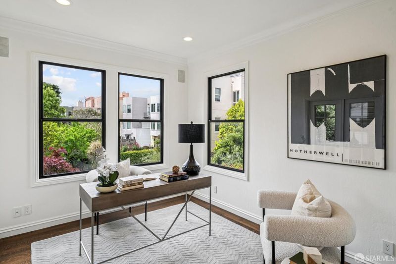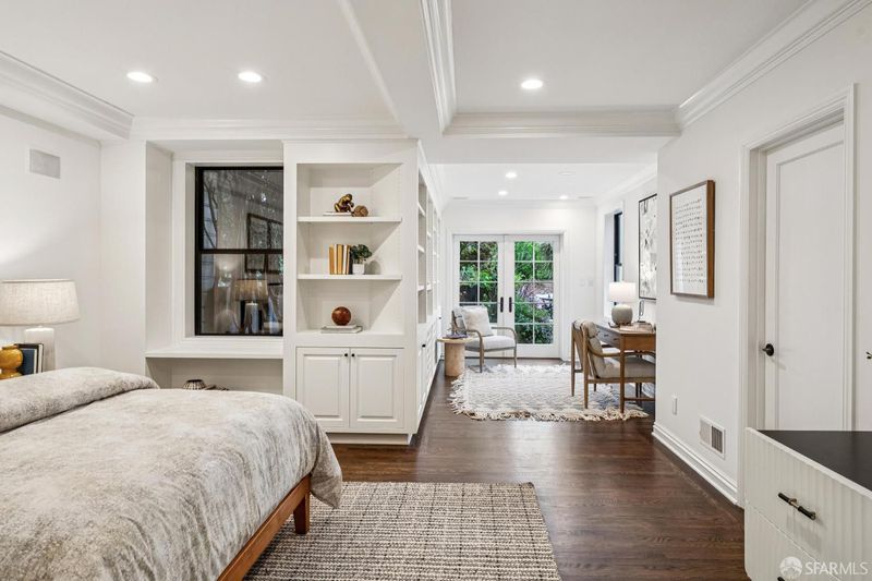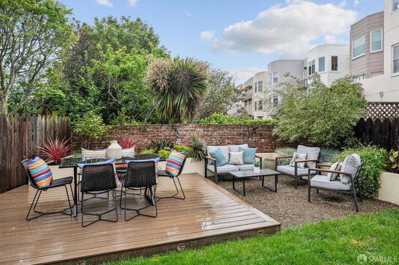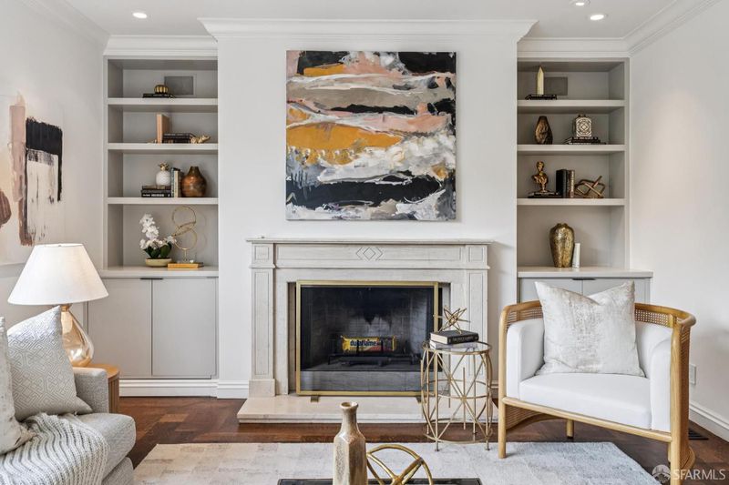 Classic 1934 Marina full floor flat + garden level. The living room has parquet floors, a wood burning fireplace, built in cabinets, recessed lighting, sconces + tall east facing windows and a remote controlled shade. The formal dining room has a designer chandelier, recessed & spot lighting.There are French doors in both the dining room & kitchen that open to a tiled patio with a trellis. The sunny kitchen has south facing windows and a built in seating area.There is a breakfast room, new quartz counters, new appliances (refrigerator, free standing gas stove, hood, dishwasher, and wine refrigerator).he primary bedroom has a sun room with Trex deck, 2 closets, a custom built wardrobe wall & ensuite bath with new microcement finishes to the floors and to the shower & bath tub surround; a new counter, wall sconces, sink & cabinet are additional features.A hallway leads from the 2nd bedroom to a guest bathroom with tile floors & shower surround. Off the hall are stairs to the garden level which has a bedroom with office, full bath and multiple closets. French doors open to a newly landscaped private garden & deck.Exclusive use yard,1 car parking, laundry, storage