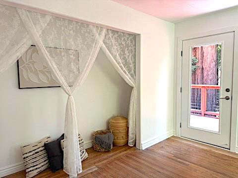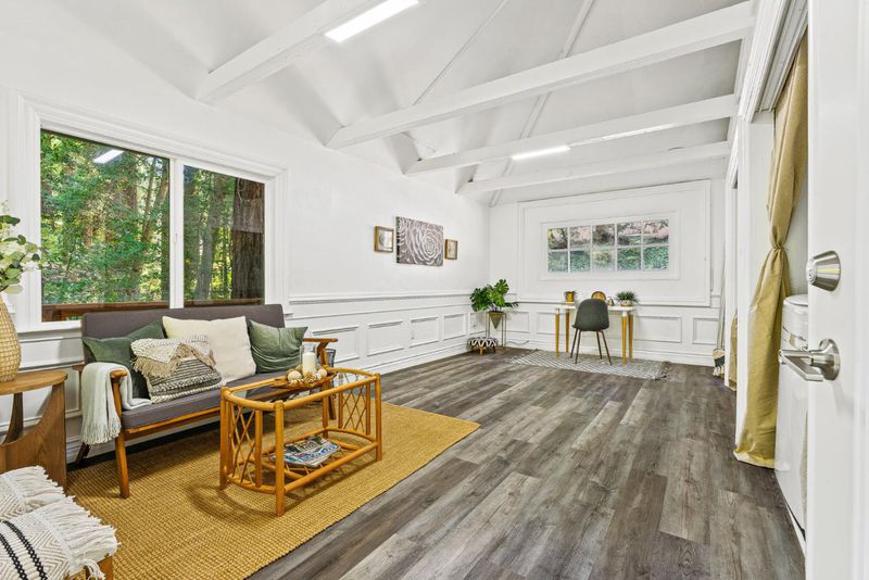 Incredible price reduction along with this unique and beautiful Boulder Creek residence nestled on a spacious 1/3 acre view lot make this property irresistible. This home features two bedrooms, including the primary bedroom on the ground floor, and two full bathrooms with updated amenities such as stall showers, floor and countertop.. The kitchen is well-equipped, boasting modern appliances including a gas oven range, replaced dishwasher, and refrigerator, perfect for culinary enthusiasts. Enjoy hardwood flooring throughout the living areas, adding warmth and elegance to the space. Cozy up in the living room with the forced air heating and view the stunning creek-side views through the huge picture windows. Dining options include a breakfast bar and a dining area. A lovely, private deck leads to a bonus room great for office, sitting room, family room - includes laundry room. Storage on lower level. San Lorenzo Valley School District, easy walk to coffee in town, good commute location.