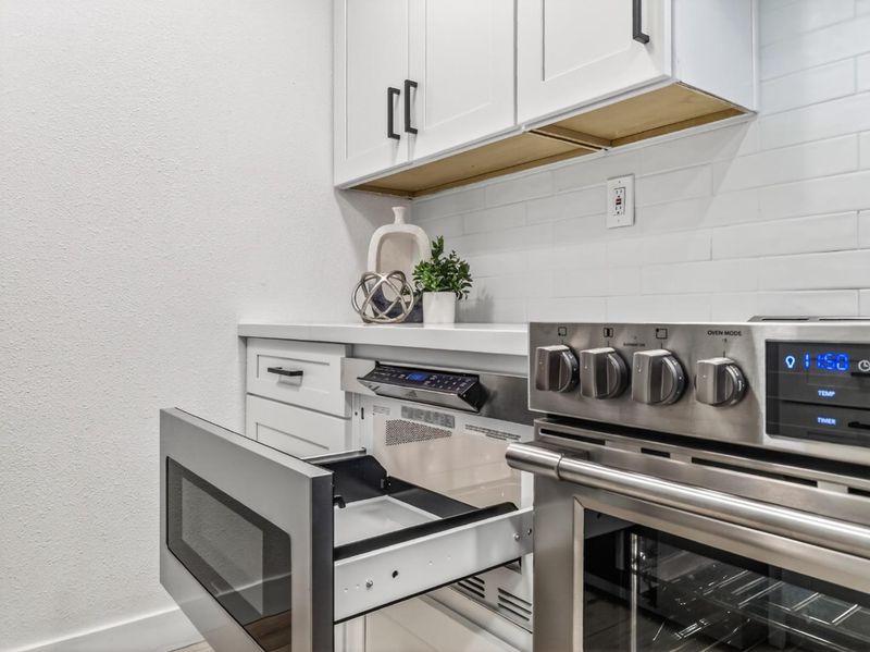 - Countertop - Quartz, Dishwasher, Garbage Disposal, Hood Over Range, Microwave, Oven Range - Electric, Refrigerator