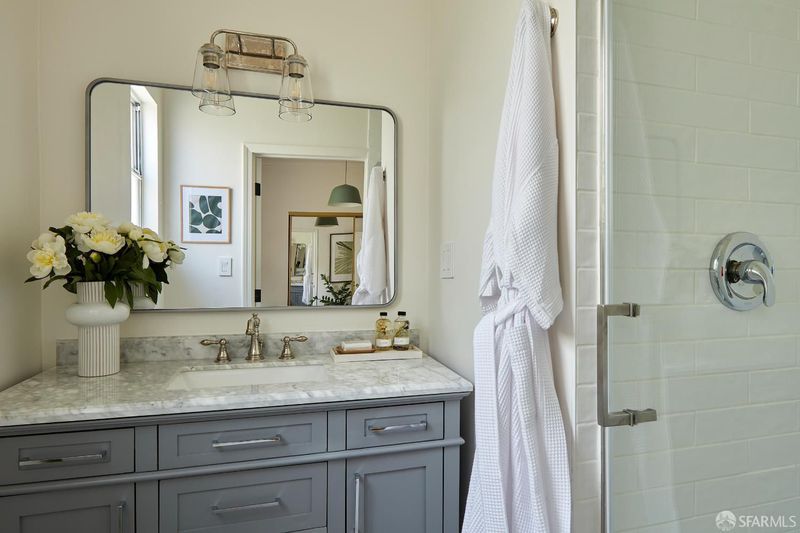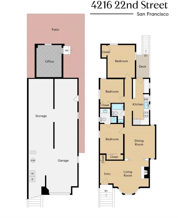 Welcome to 4216 22nd Street, where cottage core meets San Francisco charm in this updated Noe Valley single-family home with abundant parking and expansion potential. Set back from the street, this special updated bungalow features three bedrooms and two full bathrooms - one en suite - in addition to a bonus space perfect as a spacious gym or office. The entry features a coat closet and opens into the living area flanked by sun-soaked south facing bay windows and a decorative fireplace. Classic columns and built-ins connect to the dining room, large enough to host family and friends for dinner parties. The remodeled kitchen has abundant storage, updated appliances and stylish tile backsplash. A sunny deck and brick patio yard are perfect for al fresco dinners or lounging outside. The garage space cannot be under sold; it spans the entirety of the home and is perfect for storing gear, parking bikes or reimagining into additional living space. The development potential abounds. The driveway can accommodate two cars. The location simply cannot be beat around the corner from beloved local coffee shop Neighbor's Corner and just a short walk to the Noe Courts and playground, Philz Coffee and Firefly Restaurant. The quiet location and proximity to the offerings of Noe Valley's 24th Street makes 4216 22nd St the perfect retreat.