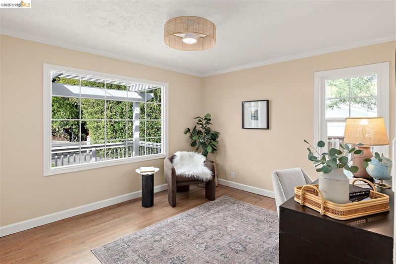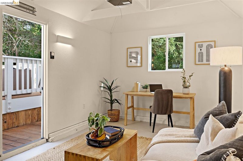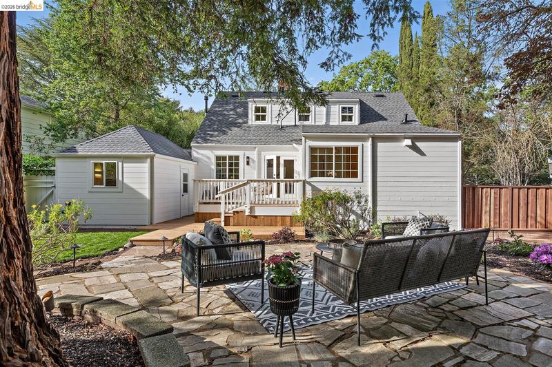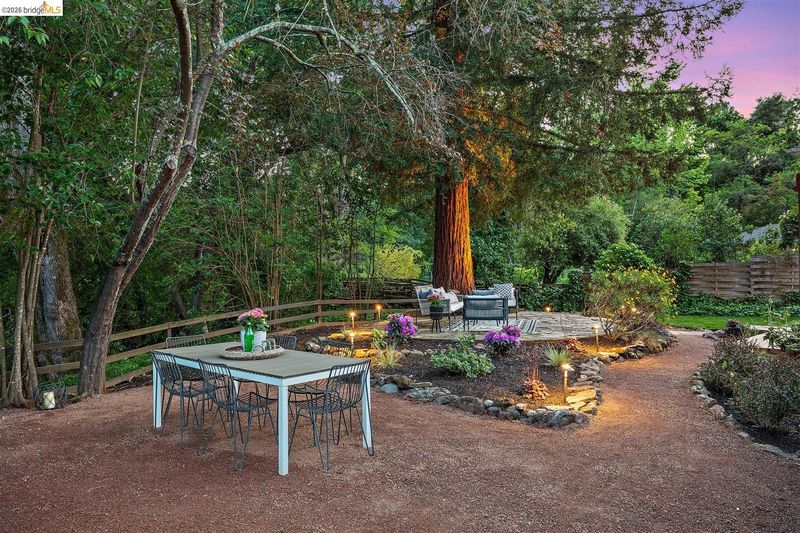 Tucked at the end of a quiet cul-du-sac in Lafayette's Hidden Valley, this newly updated 1940s Cape Cod offers genuine character, a storybook setting, and timeless building materials. A gentle creek meanders along the rear of the property, lending a sense of seclusion that feels a world away; yet is minutes from downtown, top-rated schools, freeways & public transit. Inside, the home offers four bedrooms and two full bathrooms thoughtfully arranged for flexibility. One bedroom serves as a cozy den, while another opens to a carpeted playroom, a delightful retreat for children. Period details are lovingly preserved with built-in shelving, phone niche, and rich solid oak & Douglas fir floors that speak to the home's authentic craftsmanship. At the heart of the home, a spacious eat-in kitchen and sunlit dining room with French doors to the rear yard create a natural gathering space. The adjacent living room is anchored by a Napoleon wood-burning fireplace. Outdoor living is equally compelling. A front porch with pergola sets a welcoming tone, while the rear deck, flagstone sitting area, and landscaped garden unfold gracefully toward a private creekside retreat. A detached one-car garage has been insulated and polished, offering excellent use as a studio or home office.