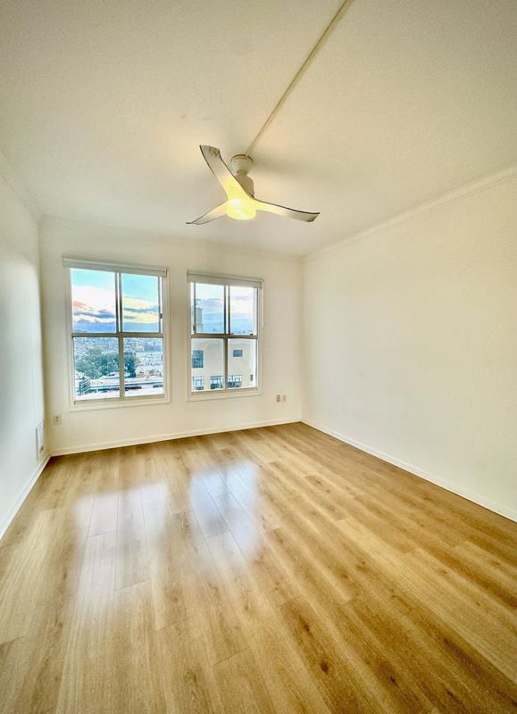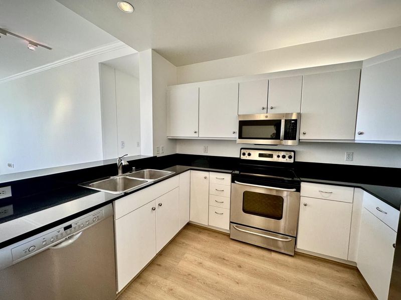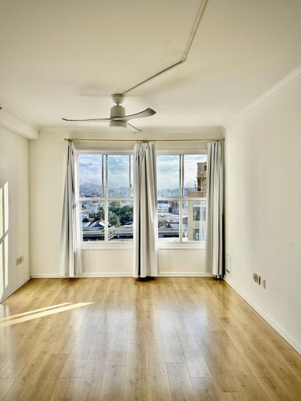 Bright, serene top-floor 1BR/1BA condo at the crossroads of SoMa, Mission, Hayes Valley, and Civic Center. Airy open-concept layout with high ceilings, classic molding, and new hardwood floors throughout. Kitchen features black granite countertops and like-new stainless electric appliances. Updated bath showcases natural stone, modern gold fixtures, and in-unit washer/dryer. Spacious bedroom includes a huge walk-in closet, ideal for a home office plus built-in shoe storage. Additional linen and utility closets provide ample storage. South-facing windows flood the home with natural light and offer stunning sunset views spanning the Mission District to Bernal Peak. Solid concrete walls ensure exceptional soundproofing. LED track lighting in the living room and HomeKit-compatible smart ceiling fans with lights in both rooms. Full amenities include a 24/7 gym with yoga/dance studio, courtyard with BBQs, conference room, and secure package area. Excellent walk, bike, and transit access: buses 49 and 14/14R at the door, 10-minute walk to Van Ness Muni and 16th St Mission BART. Tech shuttles stop out front. Secure, attached garage parking available for lease, with convenient access via Mission Street and South Van Ness, putting you just seconds from Highway 101.