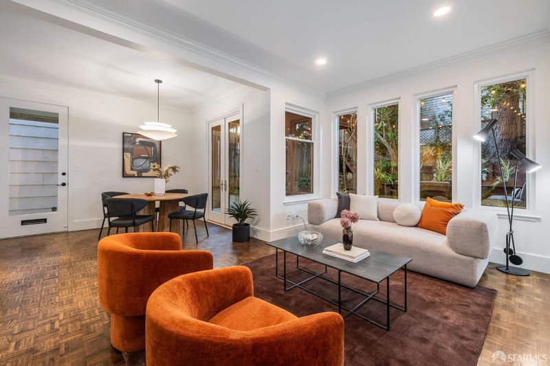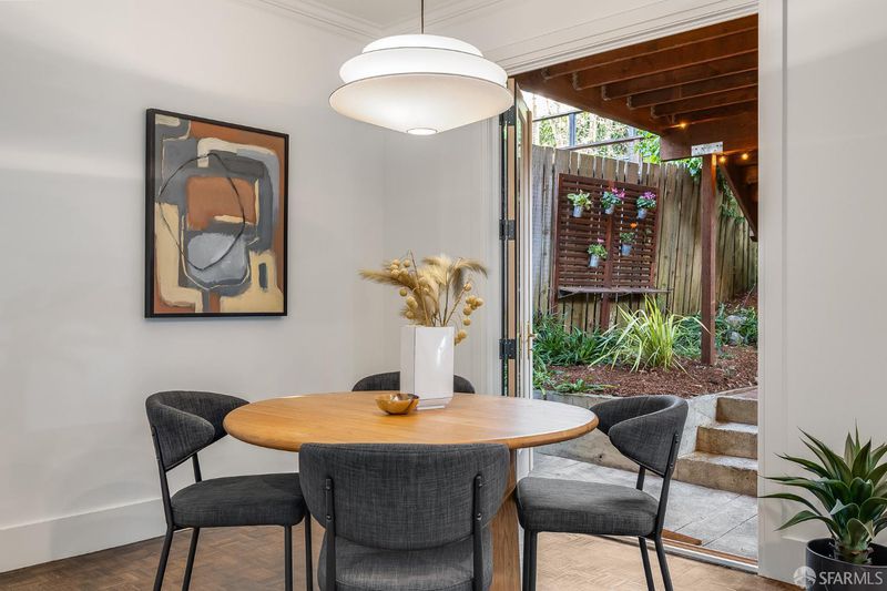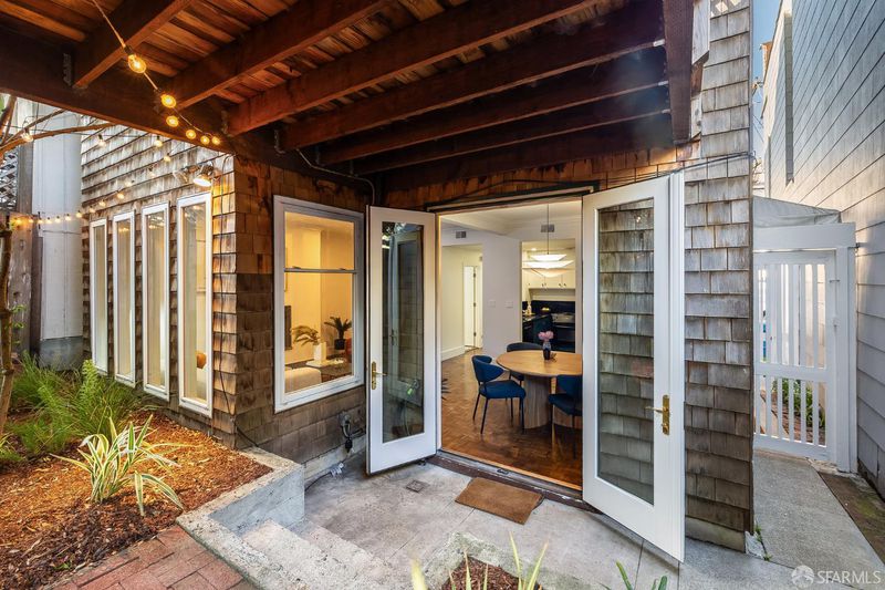 Charming garden level condominium with effortless indoor outdoor living in one of the city's most walkable, desirable locations. This two bed, one bath home features nine foot ceilings, classic wood parquet floors, and an inviting wood-burning fireplace that anchors the open living and dining area. The remodeled split bathroom offers fresh, contemporary finishes while maintaining the home's timeless character. At the heart of the home is an open kitchen, living, and dining layout that flows naturally toward the garden. French doors from the dining room open to a private, exclusive use patio and landscaped backyard, an ideal setting for morning coffee, weekend barbecues, or relaxed entertaining with friends. In-unit laundry adds everyday convenience. Located close just steps from the Presidio, Union Street, and the Marina, this home sits at the intersection of nature, neighborhood amenities, and the best of San Francisco city life. Enjoy nearby cafes, boutiques, restaurants, and green spaces, all just moments from your door.