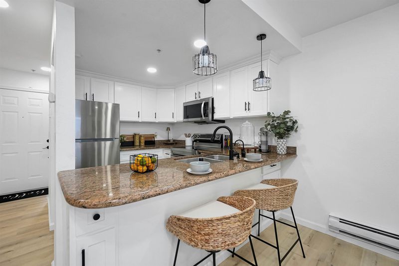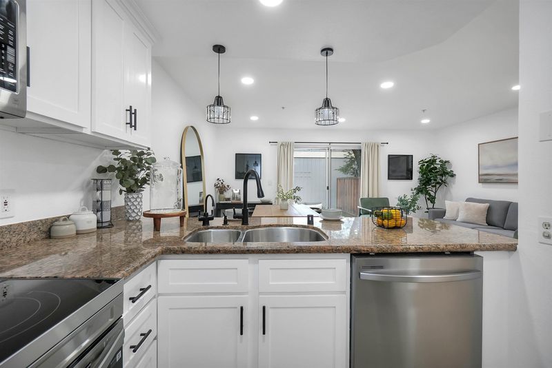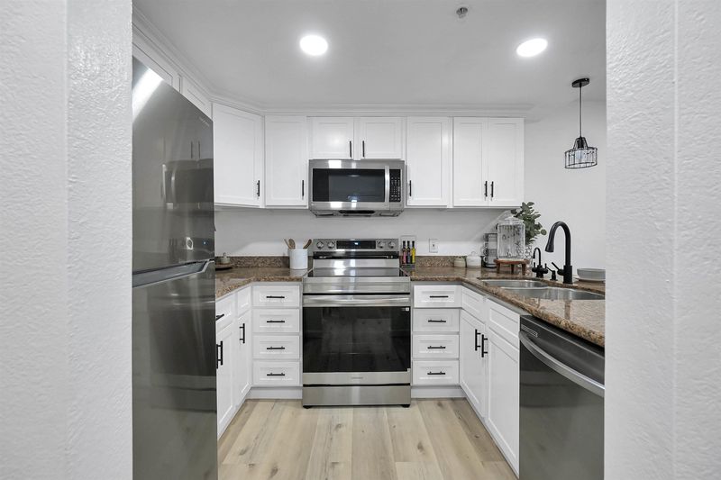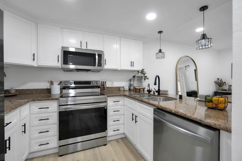 - Dishwasher, Electric Range, Microwave, Refrigerator, Dryer, Washer, Gas Water Heater, Breakfast Bar, Stone Counters, Electric Range/Cooktop, Disposal, Kitchen Island, Updated Kitchen