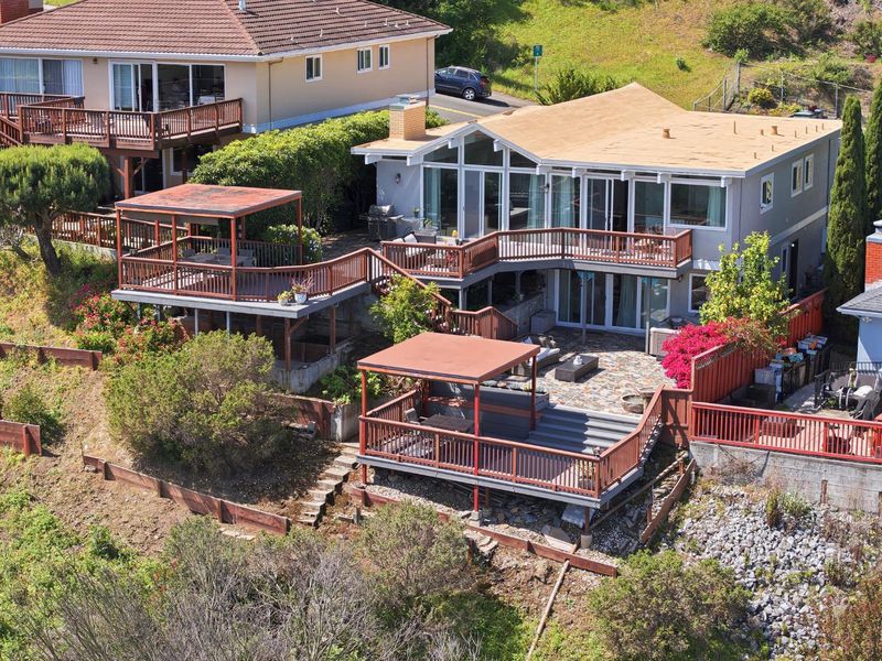 View, privacy, openness & serenity, practical living style all here. Perched in the prestigious Millbrae hills, this home offers panoramic views stretching across the Bay. Renovated in 2013 & extensively refreshed in 2026 features: modern upgrades, 2 fully equipped living floor ideal for extended family/rental. Upstairs kitchen: long island, brand-new LG stacked oven & microwave, new Samsung 5 burner cooktop. Lower level Kitchen: peninsula, 4 burner GE cooktop. 2 Bosch dishwashers, 2 newer LG refrigerator. Impressive outdoor backyard: 2 expansive decks & gazebos, multiple sitting area to enjoy sunrise light over the water - Fruit trees, 4 water fountains. Gas line for fire pit & BBQ. - A wall of 8 feet high sliding doors/windows - Central heating/cooling, tankless water heater, instant hot water, alkaline water ionizers, Fresh paint, new lighting, high ceiling, Central vacuum, electric curtain openers, walk-in closets, storage - steam shower, jacuzzi, heated seat toilets -Newer roof (Bay Cities Foam Roofing-warranty til 12/2028) -New chimney(warranty til 2/2030) -Lower-level has been city-approved with final sign-off pending due to pandemic-related delays - 2 Laundry - 2 garage, Tesla charger - Min to top schools, downtown, Saint Andreas & Sawyer Camp trails, BART, Caltrain, 280