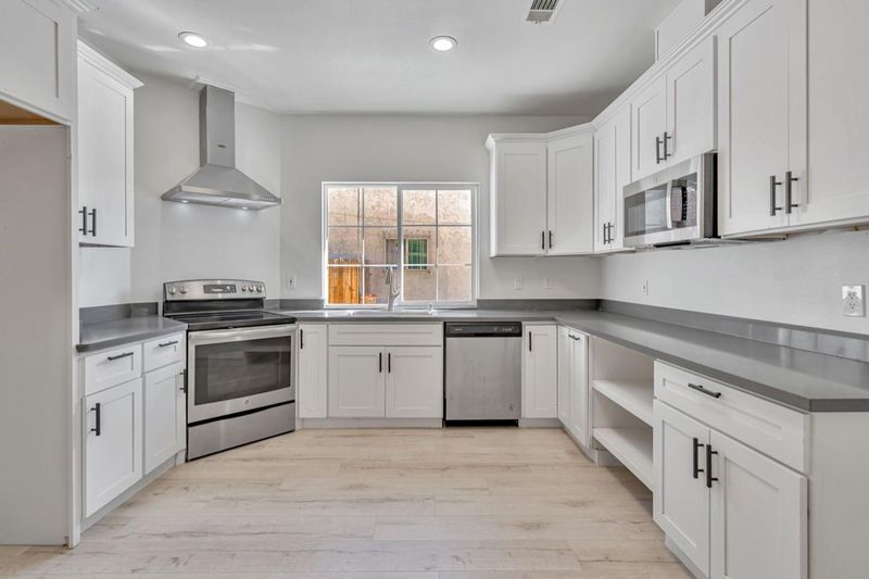 - Countertop - Quartz, Dishwasher, Hood Over Range, Microwave, Oven Range - Electric