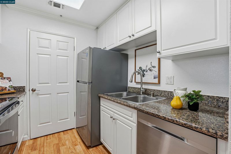 Exceptional value-Discover this beautifully updated 1-bedroom, 1-bath top-floor corner condo in San Ramon’s desirable gated Siena Hills community. This home offers abundant natural light, a quiet ambiance, and modern touches throughout, including elegant crown moldings and fresh interior paint. Stylish laminate flooring flows through the open living and dining area, creating an inviting space for relaxing or entertaining. The contemporary kitchen features white cabinetry, granite countertops, and all new stainless-steel appliances. The updated bathroom includes a granite-topped vanity with new medicine cabinet and lighting. The spacious bedroom offers ample closet space and a new ceiling light, while the private patio provides a peaceful outdoor retreat. Additional highlights include an in-unit washer and dryer, extra storage room, designated carport, and ample guest parking. Community amenities include a swimming pool, clubhouse and fitness center, with HOA dues covering water and garbage. Conveniently located near shopping, dining, Bishop Ranch, City Center, Central Park, and the Iron Horse Trail. This condo offers comfort, convenience, and an excellent San Ramon location.