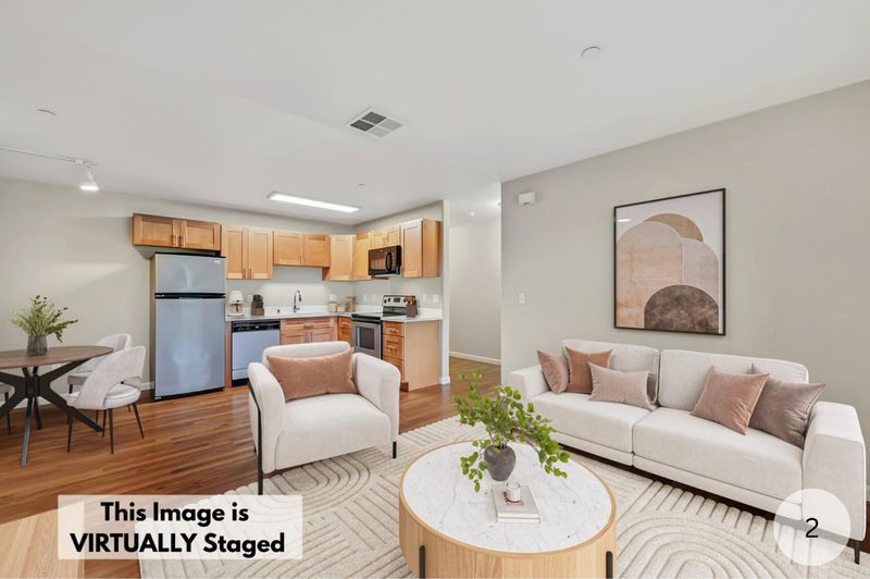 Welcome to this charming 2-bedroom, 2-bathroom home nestled in the vibrant city of San Jose. With a comfortable living area of 901 square feet, this residence offers an inviting space for both relaxation and entertainment. The kitchen is a highlight, featuring modern amenities such as quartz countertops, an electric oven range, dishwasher, microwave, and refrigerator, making meal preparation a breeze. The living area seamlessly integrates a dining space, perfect for casual meals. The home features NEW laminate flooring throughout, NEW Kitchen Cabinets, NEW Quartz Countertop, NEW sink and faucet; providing a sleek and easy-to-maintain surface. Laundry is a convenient affair with an inside setup that includes both washer and dryer. HOME IS VIRTUALLY STAGED This home provides easy access to educational facilities. Additional amenities include central forced air heating and a single-car garage. Whether you're a first-time buyer or looking to downsize, this property offers comfort and convenience in a coveted location.