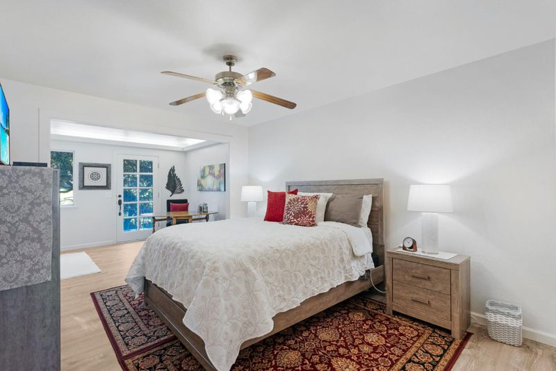 Welcome to this charming, resort-like retreat 2-bedroom, 2-bathroom recently renovated and updated home in the secure, gated community of Ridgemark. Coming home will feel like a relaxing vacation getaway! With a generous living space situated on a lot of size of 10,010 sf, this property offers ample room for comfortable, executive-style living without the excess size to maintain. Each bedroom is oversized with room for an office, workout area, or many other possibilities. The beautifully designed backyard backs up to a tree-filled ravine creating a private oasis and the newly refinished in-ground pool is a refreshing delight! The home features beautiful easy-to-main luxury vinyl plank flooring, providing a warm and inviting ambiance. Enjoy cozy evenings by the fireplace in the living area or relaxing in the primary suite, and take advantage of the open beam and vaulted ceilings, which add character and a sense of spaciousness. Skylights flood the interior with natural light. The beautifully redone/updated primary suite bathroom has a walk-in shower with beautiful new finishes; the hall bath has a relaxing jetted tub to soak your way to relaxation. Don't miss the opportunity to make this delightful property your private retreat.