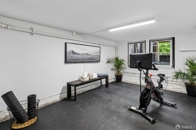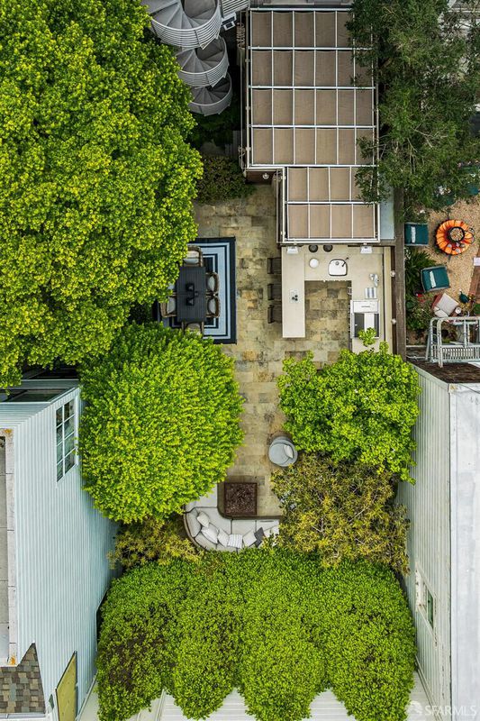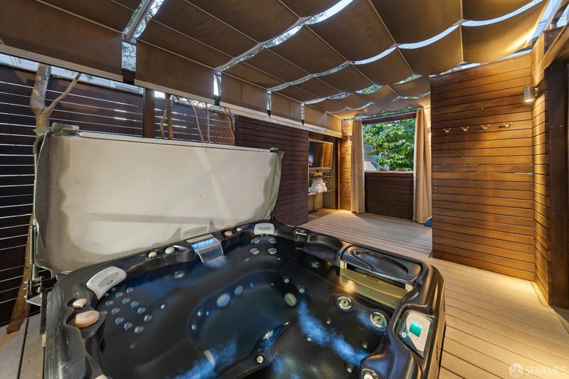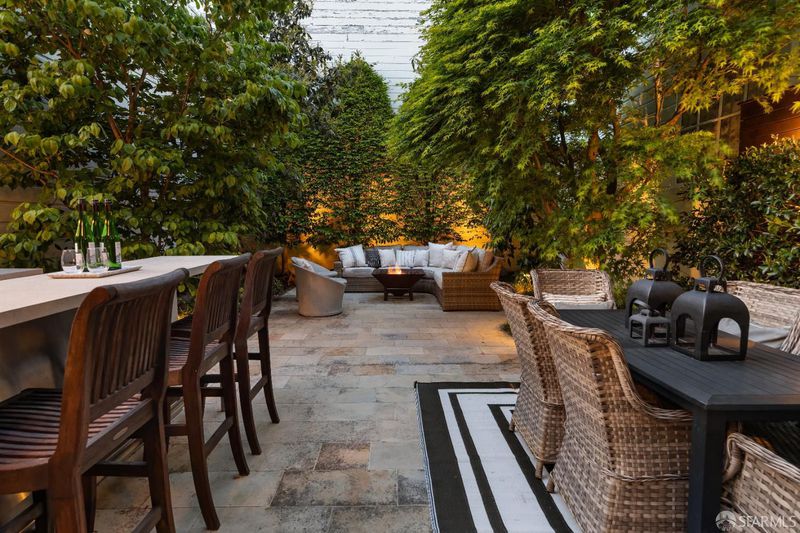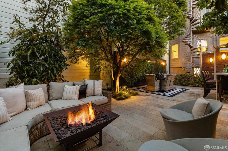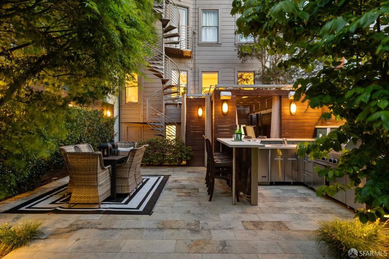 Designed for authentic California living, this 2-bedroom, 2-bathroom condominium with a sizable outdoor entertaining area thoughtfully balances classic architectural detail with modern upgrades in a well-kept, two-residence, 1906 Edwardian. Greeted by a gracious entry hall which opens to the main living spaces, where 9.5' ceilings, wainscoting, hardwood floors, and a gas fireplace lend warmth and character to the living room. Large south-facing bay windows bring in abundant natural light, while French-style prism glass pocket doors open to an expansive formal dining room with custom built-ins. The kitchen is both functional and well-finished, appointed with a Viking gas stove, quartz countertops, and a Sub-Zero refrigerator, adjacent to a laundry area equipped with stacked LG appliances. A powder room is located down the central hall with an adjacent split bath with steam shower near the guest bedroom. The spacious primary suite enjoys patio and garden outlooks, an en-suite bath, and a walk-in closet with built-ins and a safe. On the lower level, two deeded flex rooms spanning 295 sqft offer versatility for a home office, gym, wine storage, or additional utility space. Deeded for this condo's exclusive use, the large garden encompasses 1,300 sqft - well designed for both daily use and entertaining. An outdoor kitchen outfitted with Viking BBQ, refrigerator, and sink anchors the space, while generous counter space allows for easy gathering and meal preparation. Nearby entertainment areas create room for casual dining and conversation. An intimate pavilion reveals a hot tub, tucked beneath retractable awnings with curtains that can enclose the space for added privacy. A large recessed television is ideal for game-day gatherings or quieter movie nights outdoors, complemented by an integrated outdoor audio system. The gas fire pit surrounded by a well-tended garden and mature trees, integrated irrigation and subtle lighting, create a warm, inviting retreat. Additional conveniences include recessed lighting throughout, surround sound in the entertaining areas, Nest thermostat, video enabled doorbell, two-car tandem garage parking, Tesla EV charging station, and substantial storage complete this appealing Russian Hill home.