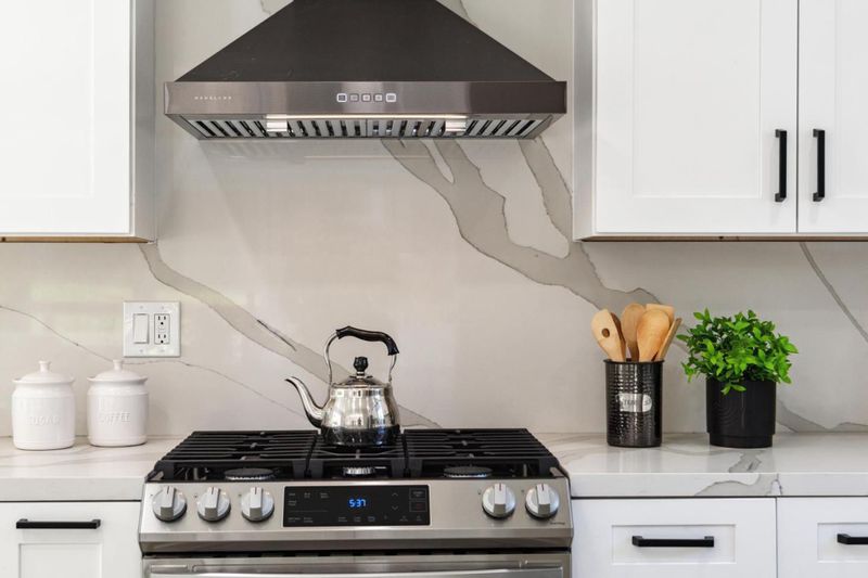 - 220 Volt Outlet, Cooktop - Gas, Countertop - Quartz, Dishwasher, Exhaust Fan, Garbage Disposal, Oven Range - Gas, Pantry, Refrigerator