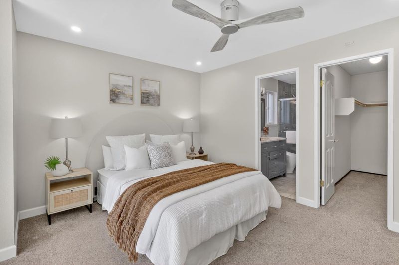 Beautifully upgraded 2-bed, 2.5-bath townhouse in the sought-after Baroni Greens community. Offering approx. 1,431 sq ft of light-filled living space, this home blends comfort and contemporary design with thoughtful updates throughout. The open-concept living area features a modern tiled fireplace, wide-plank flooring, and sliding doors to a private balconyideal for relaxing or entertaining. The remodeled kitchen includes quartz countertops, stainless-steel appliances, a breakfast bar, updated hardware, and stylish lighting. Upstairs, the primary suite offers vaulted ceilings, a walk-in closet, private balcony, and a spa-inspired bath with dual vanities and custom tilework. The second ensuite bedroom provides flexibility for guests, an office, or gym. Additional highlights include fresh paint, dual-pane windows, upgraded HVAC, in-unit laundry, and an attached garage with interior access. HOA amenities feature a pool, jacuzzi, playground, and landscaped open areas, with exterior and roof maintenance included. Conveniently located near Highways 85, 87 & 101, shopping, dining, parks, and major Silicon Valley employers.