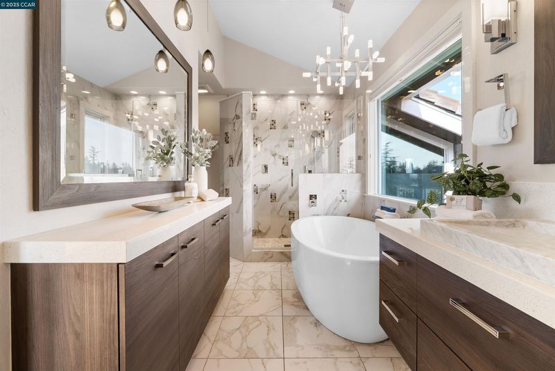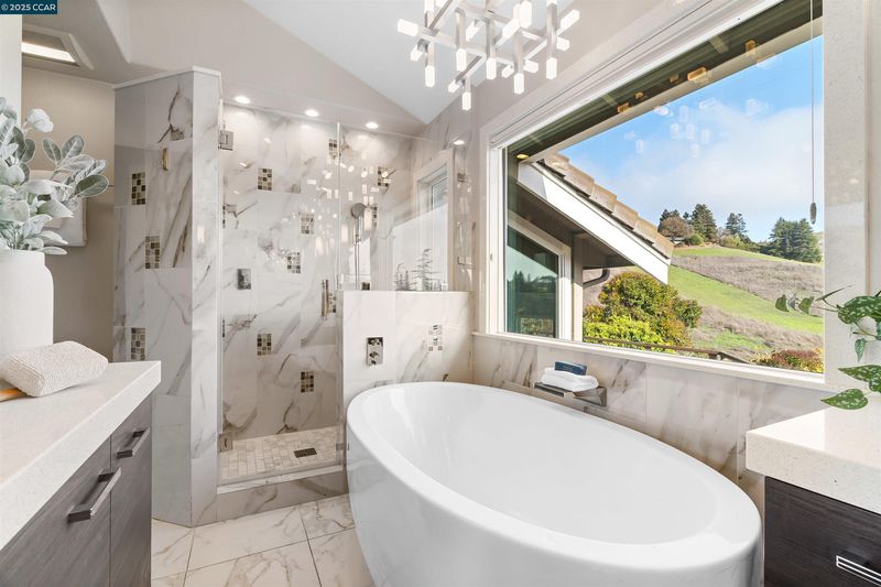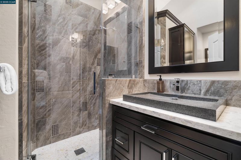 Skylight(s), Stall Shower, Tile, Updated Baths, Double Vanity, Dual Flush Toilet, Multiple Shower Heads, Outside Access, Stone, Window
