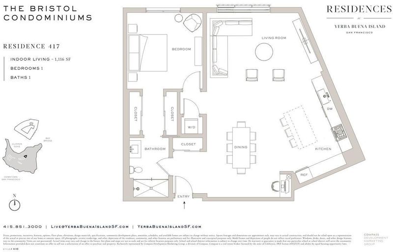 The Residences at Yerba Buena Island offer a rare opportunity to enjoy tranquil island living with effortless access to Downtown San Francisco. Brand new spacious 1 bedroom with parking at The Bristol boasting ~1,116 sq.ft. of living space and a lovely courtyard view. Nearly 10-foot ceilings and floor-to-ceiling windows create an open, airy atmosphere. The chef's kitchen is appointed with Arclinea Italian cabinetry, a large kitchen island, Miele appliances, and Dornbracht fixtures, complemented by wide-plank white oak flooring and a level-4 wall finish. The spa-inspired bathroom includes a Carrara marble countertop and an oversized walk-in shower. Residents enjoy access to 72 acres of open space with scenic trails. As a part of Treasure Island, there are eight new parks and the best kept secret, Clipper Cove and Clipper Cove Beach. The Residences at Yerba Buena Island include a state-of-the-art fitness studio, resident lounge and terrace with fireplace and rooftop BBQ lounge. The resident experiential programing includes attended lobby with coffee service, monthly social events and resident gatherings, and 24/7 roving security. The wellness program includes fitness and mind/body classes. Complimentary shuttle service connects to the Yerba Buena Island/Treasure Island ferry and an approximately 8-minute ride to the San Francisco Ferry Building (monthly transportation pass included). Secured garage parking included (parking may be excluded for a $115,000 price reduction). Images are from a similar model home.