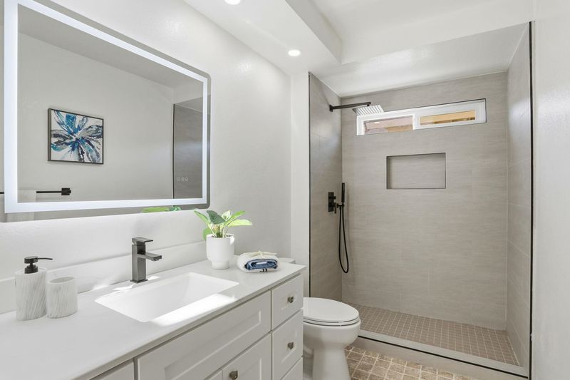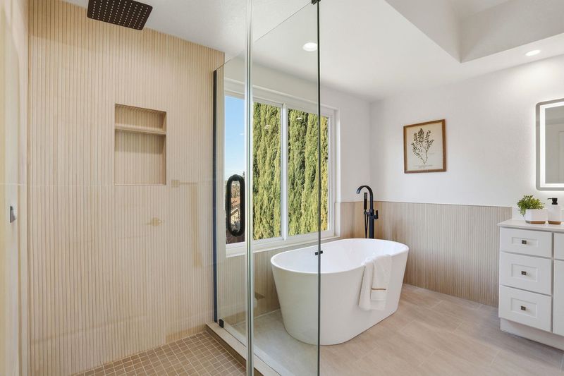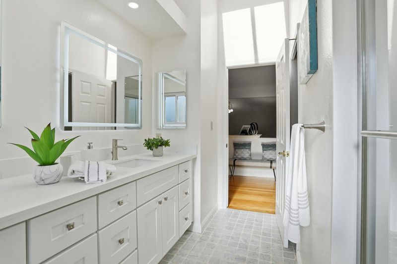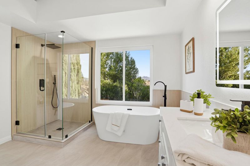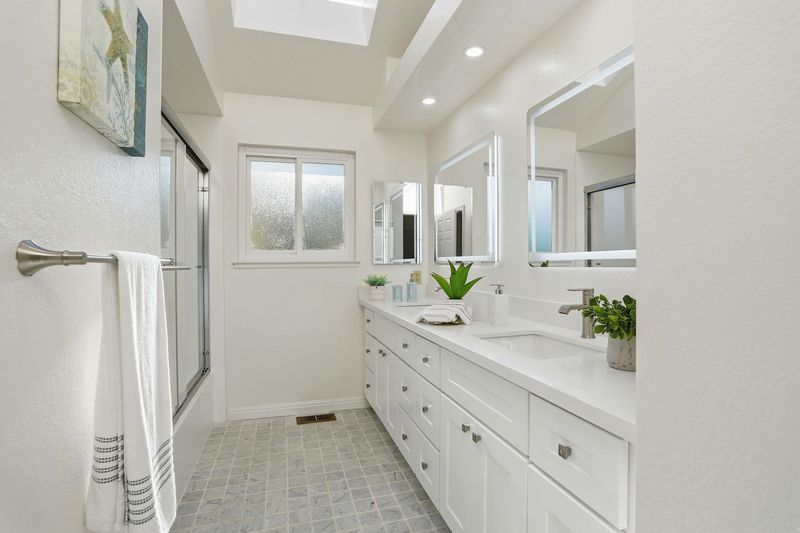 - Shower Over Tub, Skylight(s), Solid Surface, Split Bath, Stall Shower, Tile, Double Vanity, Window
