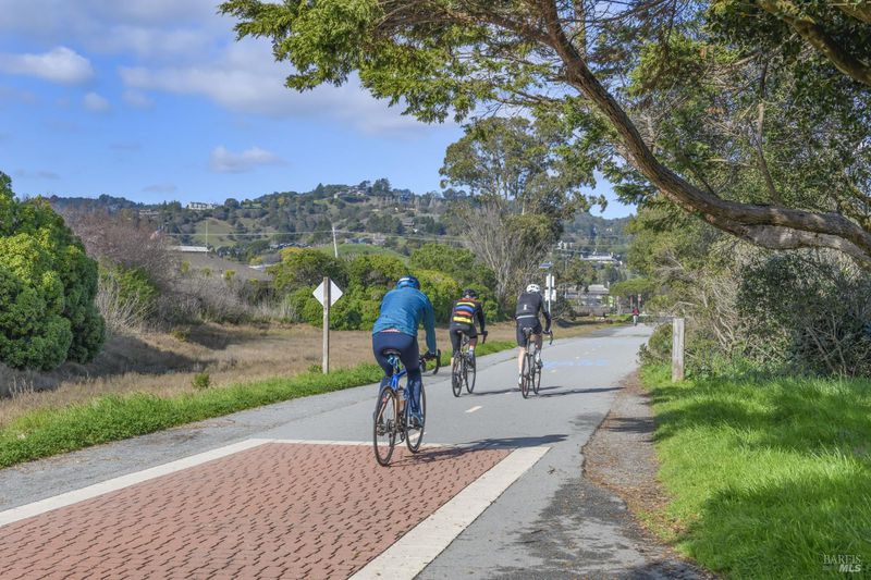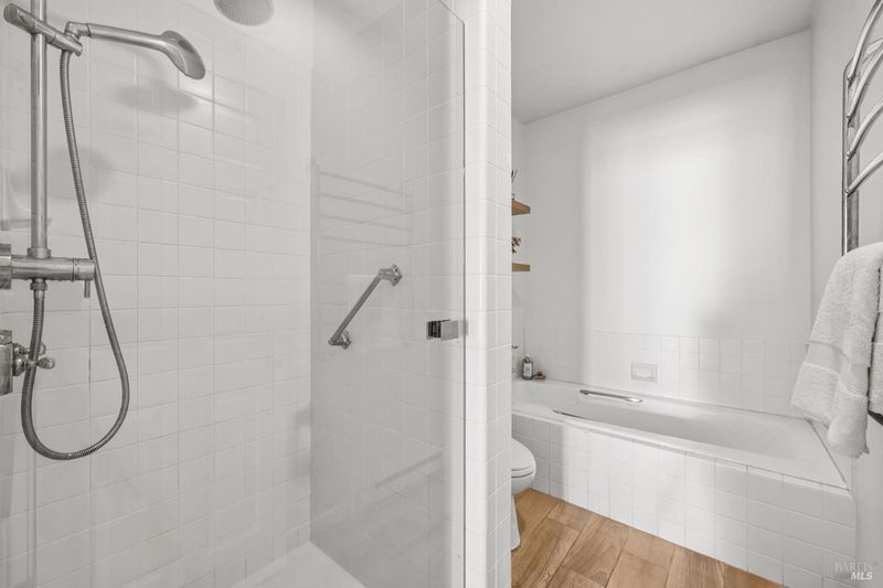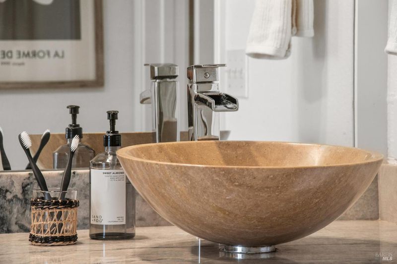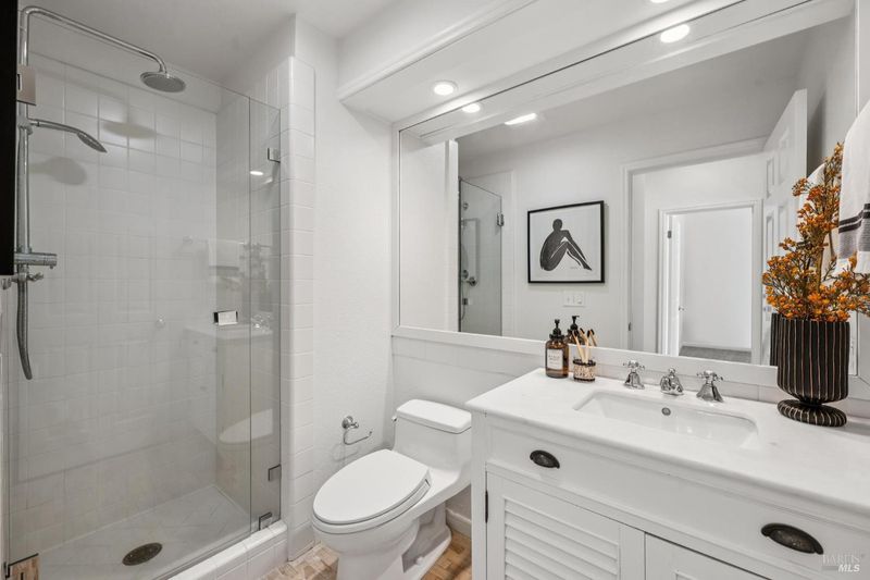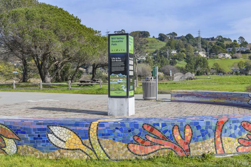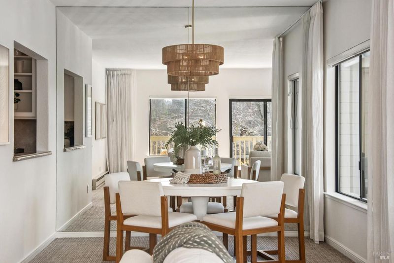 Set in a desirable southeast corner of the Eucalyptus Knolls complex, this bright and airy residence welcomes abundant natural light through expansive windows and enjoys an exceptional Southern Mill Valley setting near miles of scenic paths and parkland. Upon entering, the open-concept living and dining rooms feel gracious and luminous, designed for both relaxed living and elegant occasions. A marble-surround fireplace anchors the living room, while a Parisian-inspired bar with wine fridge enhances entertaining, and a separate freestanding display cabinet adds refinement. In the dining area, a mirrored feature wall amplifies the natural light and enhances the sense of openness, while a statement light fixture lends a touch of coastal elegance. Glass doors extend the living space outdoors to a tranquil deck with verdant outlooks and gentle birdsong. Timeless in design, the kitchen showcases warm granite countertops, quality cabinetry, and stainless-steel appliances, while a fully integrated desk creates a dedicated workspace and a pass-through to the dining area ensures effortless entertaining. Bathed in southern light, the spacious primary suite offers a peaceful retreat with an en-suite bath featuring stone vessel sinks, generous vanity storage, and a separate room with soaking tub, shower, and heated towel rack. A large walk-in closet with custom organization completes the suite. Bright and inviting, the second bedroom provides versatility with a built-in bookcase and organized closet, and enjoys access to an adjacent bath with a marble-topped vanity and stall shower. Custom window coverings enhance beauty and privacy throughout, while a hallway laundry closet adds everyday ease. Two covered parking spaces and storage provide convenience, while resort-style amenities including a pool, spa, and two tennis courts enrich lifestyle. Just moments from Bayview Meadow and the scenic paths and open green space of Hauke and Bayfront Parks, this is Marin living at its most carefree and connected.