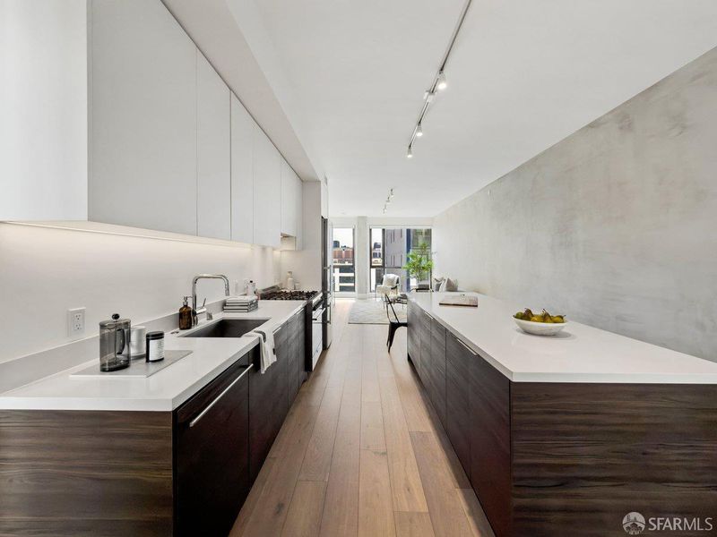 Ideally situated in the heart of Polk Gulch, adjacent to Nob Hill and Pacific Heights, this residence offers an exceptional central location with convenient access to some of San Francisco's best shops, restaurants, cafes, bars, and daily amenities. Multiple grocery stores, schools, and public transportation options are all within close proximity, with easy access to surrounding neighborhoods including the Financial District, Japantown, and Civic Center. Constructed in 2019 with concrete and steel, the building offers a high level of quality and durability, along with secure entry, intercom system, and a dedicated package reception area. Located on the 6th floor with a desirable southeast orientation, this home enjoys abundant natural light throughout the day and city views from every room. The well-designed floor plan offers a true three-bedroom layout, ideal for a variety of living arrangements. The main living areas feature wide-plank hardwood flooring, creating a warm and modern aesthetic. The spacious chef's kitchen is equipped with a high-end stainless steel appliance suite, sleek cabinetry, and a large island with bar seating, ideal for both everyday living and entertaining. The two secondary bedrooms offer comfortable accommodations with ample closet space. The guest bathroom includes a shower over tub. The primary suite enjoys a pleasant southern outlook and features a large walk-in closet, dual vanity, walk-in shower, and a separate water closet for added privacy. Additional highlights include in-unit stacked laundry in a dedicated closet, air conditioning, a rare and valuable feature in San Francisco and one deeded parking space along with additional storage. Residents enjoy access to an expansive, furnished rooftop deck with multiple lounge areas, panoramic city views, and a BBQ and cooking area, perfect for relaxing or entertaining. This is a rare opportunity to own a well-constructed, light-filled 3-bedroom home in one of San Francisco's most central and desirable neighborhoods.