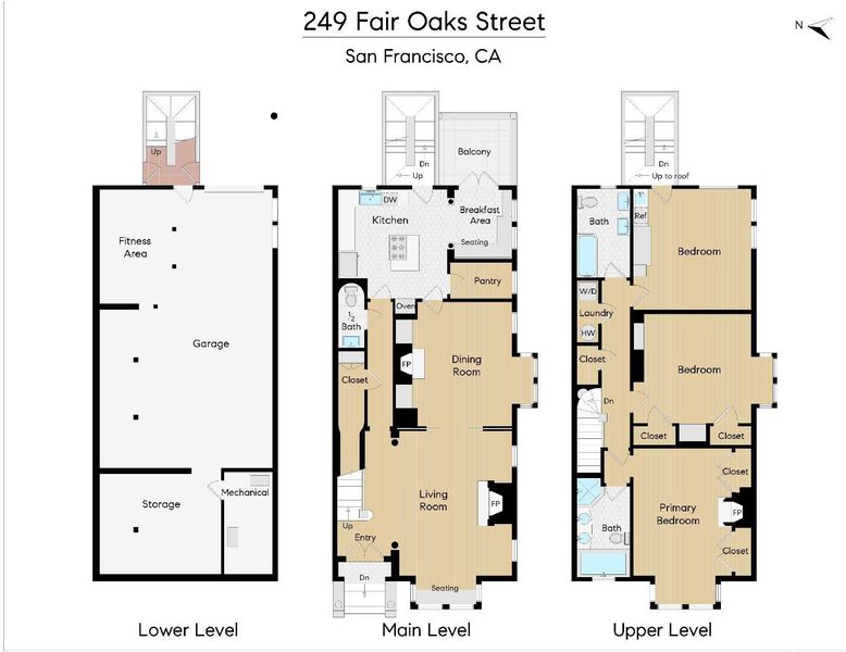 What can be more San Franciscan than a majestic Victorian home, with an inviting garden, on a beautiful tree-lined street, in the immediate vicinity of many of the vibrant cafes and restaurants that define our extraordinary City? 249 Fair Oaks is a fully detached 19th century architectural masterpiece that has been lovingly restored and remodeled to the delight of its 21st century stewards. The graceful Victorian home is a celebration of aesthetic pleasure that carefully balances the charm and refinement of what is old, with the utility and functionality of what is new. To live in this home is to be constantly reminded of the joy that craftsmanship, art, and beauty offer us; contributing mightily to our inner peace, power, and pleasure. With 3 bedrooms and 2.5 bathrooms, voluminous public rooms, all on an irregular 32' x 117' lot, the home abounds in unique features and amenities. The Victorian era bay windows, grand staircase, quiet veranda, ornate fireplaces, endless architectural detail, and intricately adorned dining room chandelier, blend seamlessly with the modern chef's kitchen, featuring a BlueStar Range and wall oven, Sub-Zero refrigerator, marble counters, center island, breakfast room, and more. The gated side driveway leads to a full garage / basement that will delight "motor heads", cyclists, and all those with lots of life's "good stuff" who dream of having the storage space to keep, collect, and display it! Mature shade trees grace the whimsical east garden, adding to the privacy, serenity, and allure of this San Francisco oasis. The stoutly built rear staircase leads all the way up from the garden level to the roof level, from which views of the downtown skyline and Bay Bridge serve as a constant reminder that 1849 marked but one of the many Gold Rushes that have brought artists, visionaries, disruptors, and entrepreneurs to the shores of our beloved City, generation after generation.