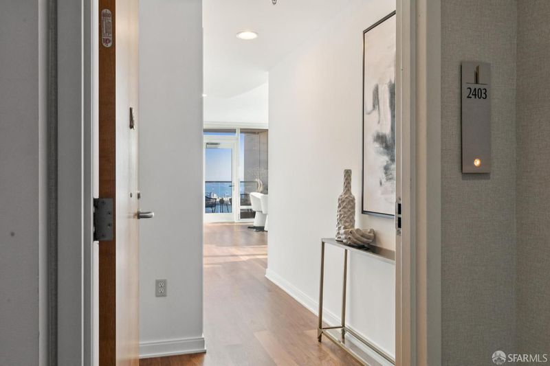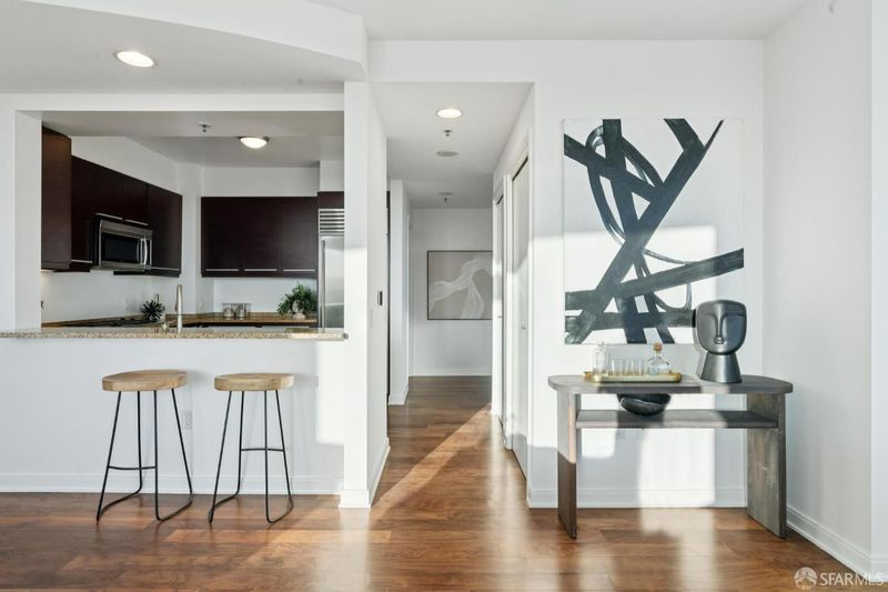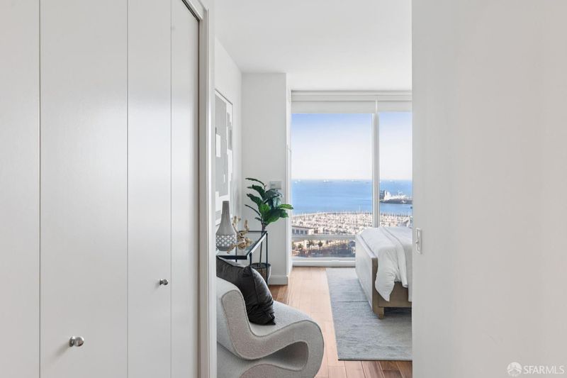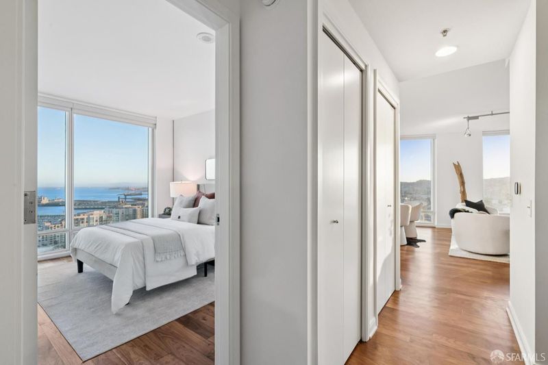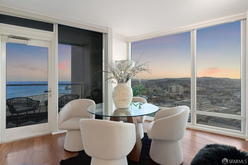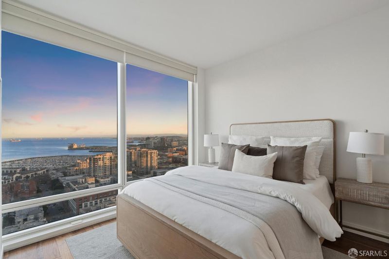 Perched elegantly on the 24th floor of the prestigious Rincon Hill, this expansive 2-bedroom, 2-bathroom residence is bathed in natural light and showcases panoramic southwest corner views of the bay, Oracle Park, and breathtaking sunsets over Twin Peaks. Unit 2403 is defined by its exceptional design, featuring an open layout with high ceilings, ample storage, and a private balcony. The chef's kitchen is equipped with premium Bosch appliances, Italian del Tongo cabinets, and a Sub-Zero refrigerator. The primary suite offers stunning water views, an en-suite bathroom with a separate shower and soaking tub, and is enhanced by a spacious walk-in closet. Additional upgrades include premium hardwood floors in bedrooms and throughout home, custom closet systems, and window shades adorning all floor-to-ceiling windows. Residents enjoy hotel-quality amenities such as a 24-hour door host, concierge services, valet parking, two fitness centers, a heated pool, hot tub, BBQ areas, an outdoor fireplace, steam room, gym, clubhouse, and exclusive access to Uncle Harry's Penthouse Lounge at The Harrison. The location offers easy access to highways 101, 280, 80, and the Bay Bridge.