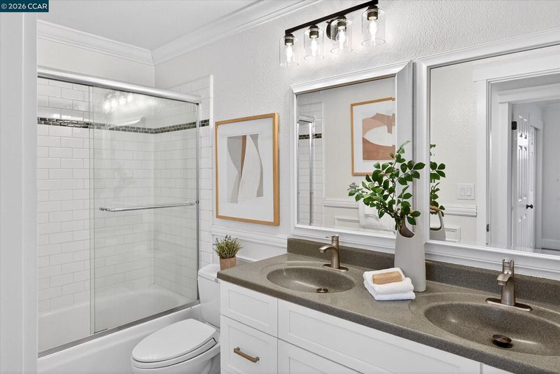 - Shower Over Tub, Solid Surface, Tile, Updated Baths, Double Vanity